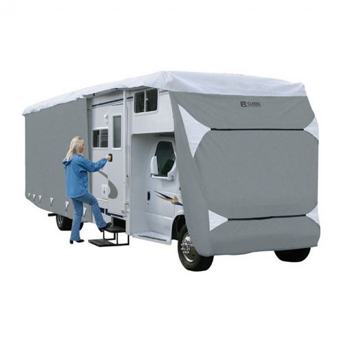 PolyPRO™3 RV Class C Cover gray 29-32 ft. The thick, triple-ply Polypro 3 top and single-ply sides protect your RV against rain, snow, dirt, nicks, and scratches for all-season protection. An integrated air vent system combined with quick drying Polypro 1 sides reduce wind stress and vent inside moisture. With adjustable front and rear tension panels and elasticized hem corners, you get a custom, secure fit. Access RV doors and the engine area without removing the entire cover with zippered panels, so you know you can cover your RV and still maintain or use it while it is stored. Its integrated rope attachment system and a provided toss bag helps to reduce the need for crawling under the RV, and stuff sacks and ladder caps are included.