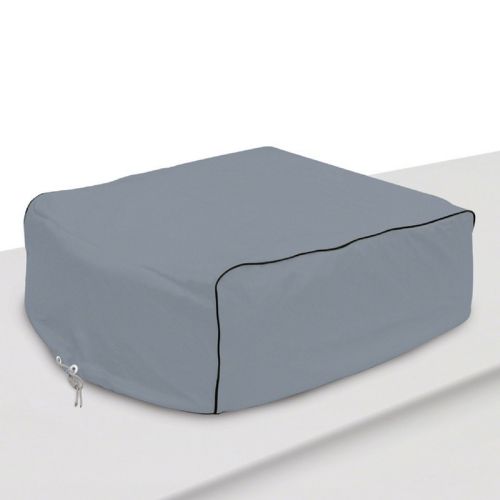 RV Air Conditioner Cover gray Medium. Protect your RV A/C unit from weather and debris with this great, easy-to-install cover. Sleek and stylish, it is waterproof with a soft backing so your A/C will not be harmed. Featuring two heavy-duty straps, a draw cord for security, and a heavy, thick construction, you can depend on this cover in all weather.