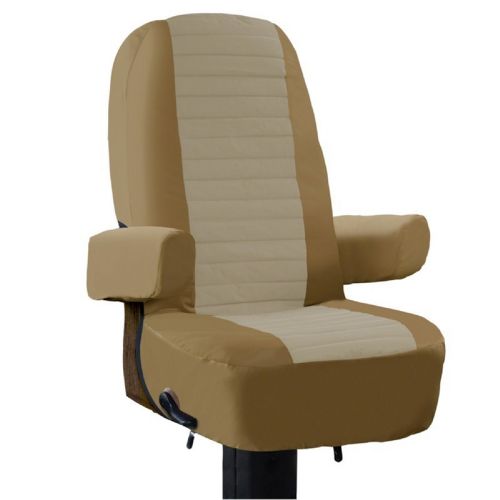 RV Seat Cover Tan. Quickly fits to keep seat clean and comfy with a semi-custom fit for RV captain-style seats. Access hole for seat adjustment lever. This great, classic cover protects new seats and renews the look of old seats. Elasticized hem provides a quick custom fit. Integrated stabilizer tubes secure cover to seat bottom.