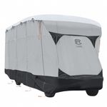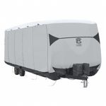 RV STORAGE COVER: Bonded DuPont Tyvek top for UV and water protection, integrated undercarriage strap system with multiple click-close straps and a weighted toss puck system eliminates crawling under the RV.