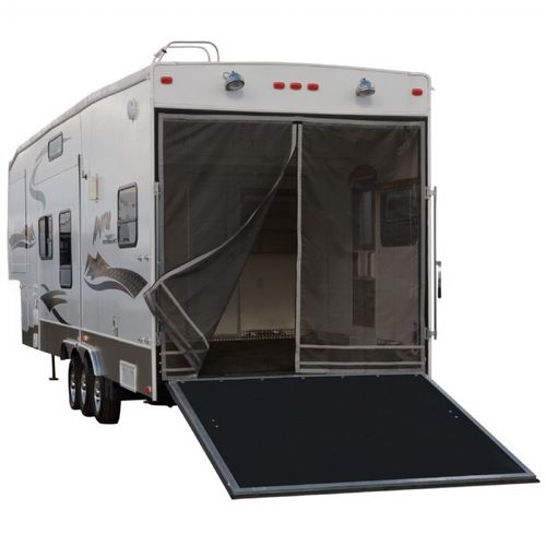 Toy Hauler Screen Rip Grip Black. The screen keeps out bugs and shades the interior. Its heavy-duty screen material lets in air, keeps bugs out and provides shade. With adjustable width and height, you can customize the fit to your hauler. Includes detachable gray PolyPRO™ privacy screens that can be quickly attached to the outside of the screened panels with rip-and-grip strips. Zipper door closure. Top of the screen attaches with rip-and-grip strips, screen sides attach with rip-and-grip strips or magnets depending on model.