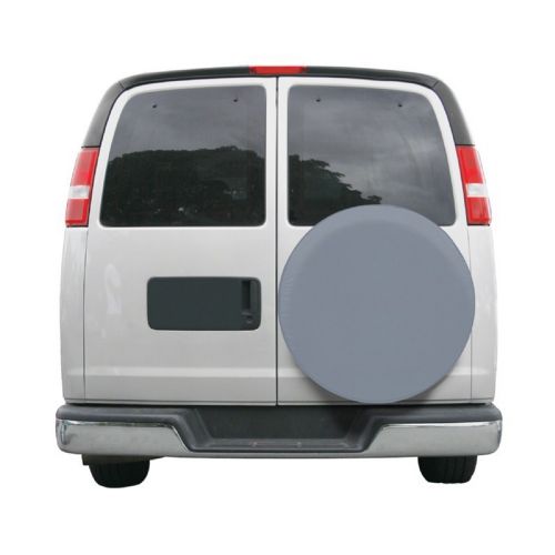 Custom Fit Spare Tire Cover 32 inch gray. Attractive protection for spare tires on RVs, vans or truck. Sized for a custom fit. Tire sizes are listed on back of package so customers can determine sizing without measuring tires. Elasticized back hem for a fast and adjustable fit.