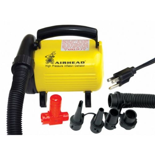 High pressure electric pump. Peak pressure is 2.5 psi, plenty of pressure to get high end inflatable boats, rafts and reinforced backyard items nice and firm. You'll immediately notice how they perform better when properly inflated. A Pressure Release Valve is included to limit pressure to 1.5 psi for preventing over-inflating towables, pool toys and other vinyl and nylon covered inflatable items. The accordion-style hose locks onto the pump, eliminating annoying disconnections. Four universal valve fittings fit all popular valves and lock onto the hose. You'll love the screw-on Boston Valve adapter, an AIRHEAD exclusive. For added convenience, there's a carry handle and a 10 ft. long power cord. Draws 6.3 amps. Volume: 460 liters/min.
