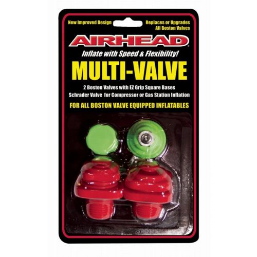 AIRHEAD® MULTI-VALVE consists of 2 Boston valves with different thread patterns on the bottom and a Shrader valve with cap. One of the Boston valves is sure to fit the thread pattern of your inflatable, no matter what brand. The Boston Valves have a square base, which is much easier to turn than a round base, especially with wet hands. Use the Shrader valve to inflate your inflatables at a gas station or with an air compressor. Alternatively, screw off the Shrader valve and inflate the Boston valve with an AIRHEAD air pump. All components are bright red and green, so they're easy to find.