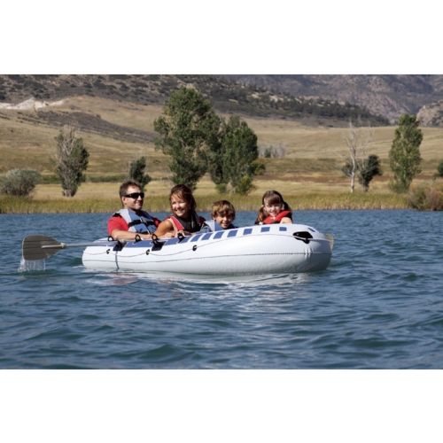 Airhead four person inflatable boat. Designed for fishing or good old fashioned family fun. Lightweight, portable and ideal for lakes and slow moving streams. Constructed of heavy duty vinyl with electronically welded seams. Factory tested for quality assurance. Equipped with an Inflatable floor, wrap around tow rope, oar locks and oar holders. Repair kit included.