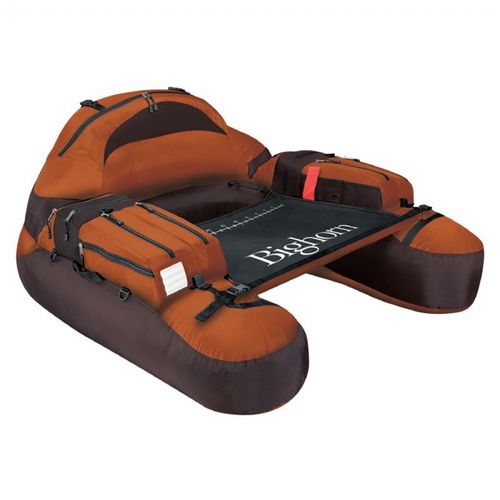 Bighorn Inflatable Fishing Tube Boat. Enjoy the extra room, comfort, and buoyancy of this extra large, front-entry float tube. Its extra large and comfortable backrest will let you lean back and relax while you're out on the water. The unique sculpted design and hydrodynamic hull shape provide improved tracking and steering. It has a stripping apron with fish ruler, horizontal rod holder, and D-rings for attaching gear and creel bags. With almost more space than you'll know what to do with, the roomy armrest storage with additional reel pockets, gear pockets, small mesh pockets and flat zip pockets, as well as rear storage pocket and exterior mesh storage pocket. Some safety features include quick-release stripping apron, safety flag pocket, and safety labeling as per ABYC standards.