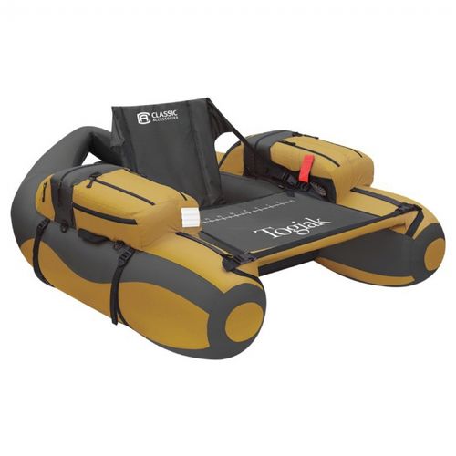 Classic Accessories LogoTogiak backpackable float tube fishing boat. Perfect for serious fishing trips. 300 lbs capacity allows even heavy adults. Made with 420D Coated Nylon fabric. Hydrodynamic hull shape for improved tracking, steering, stability and buoyancy. Adjustable backpacking shoulder straps. Extra high seats for drier and warmer fishing and improved visibility. Extra comfortable thickly padded seat with a high adjustable backrest provides support and comfort for long fishing days. Mesh stripping apron with fish ruler. Roomy armrest storage with additional reel pockets, gear pockets, small mesh pockets, and flat zip pockets. Safety features include quick-release stripping apron, safety flag holder, orange rear visibility panel and Boston valves for quick inflation and deflation. Assembled size: 54.25"L × 47"W × 19"H . Color Gold and gray.