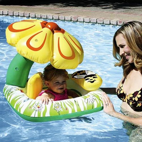 Busy Bee infant pool raft for infants and babies. Provides a wonderful way to help youngsters 2 years and under get used to having fun in the water, with parental supervision. Baby pool raft is decorated with daisies and has a flower shaped canopy shade top for protection against sun. The pocket seat has leg holes for kick-powered action. Built of sturdy 10-gauge vinyl. Fits most infants and babies 6 months to 2 years. Size 37 inches × 34 inches. Easy to inflate and easy to deflate.