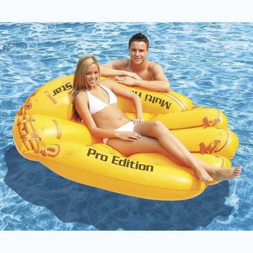 Baseball float inflatable lounge float for the baseball fans. Inflatable has a contoured shape. Four seperate air chambers. Soft pillow top provides for extra comfort. Made of durable 14-gauge vinyl. Size 64" × 48".