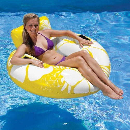 Yellow Day Dreamer Lounge is a tube style float. It is a big floating tube with a large backrest for super comfort. Sturdy, bonded handles provide convenient grips. The 50" diameter lounge features heavy vinyl construction, a built-in drink holder, and it comes in gaily colored print patterns.