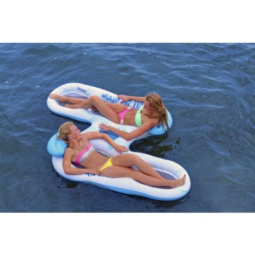The Ahh-Qua Lounge is a great tandem way to enjoy the lake or pool this summer. With two lounge-style floats attached by a center cooler console, you and one other person can laze across the water in unison. The white mesh bottoms will allow you to touch the water while you float on it, keeping you cool in hot weather, and the inflated head rest pillows add the perfect finishing touch to a great, relaxing double float!