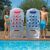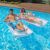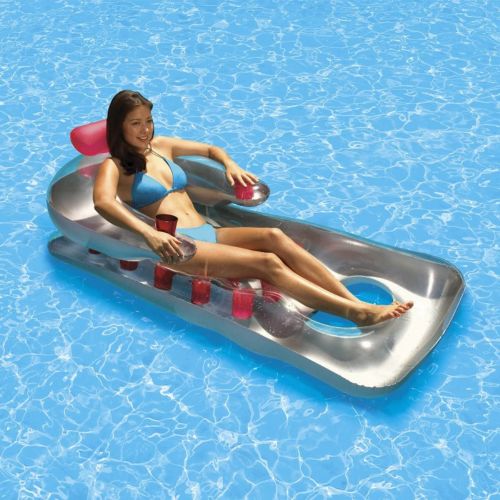 Infatable French Classic Pool Lounger with pink accent offers great luxury and comfort. New luxurious pearl-finish vinyl materials. Classic French-style construction with tufted, contrasting pockets and matching pillow headrests. Both arms have cup holders.