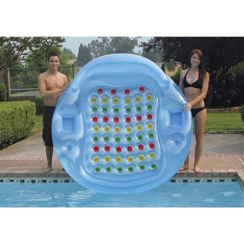 French cooling island for two people. Large 80 inch island float with 54 french cooling pockets. Single section back for added comfort. Built-in beverage holders and ice bin. Size: 80 inch diameter.
