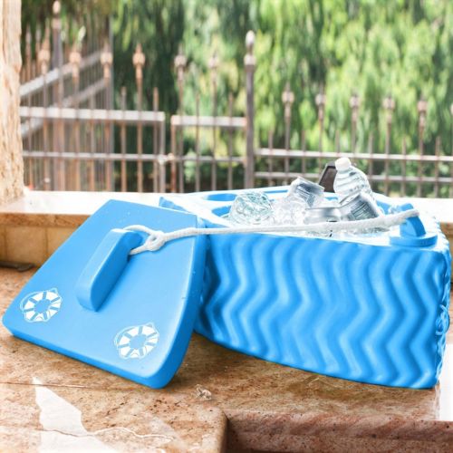Bahama Blue SS Goodlife from TRC. Floating cooler featuring individual compartments and placeholders to accomodate a mixed assortmenst of beverages, containers, snacks and personal items. Easily holds up to 18 beverages. Close the cap for keeping the cooler shut. Great item for pool or beach.