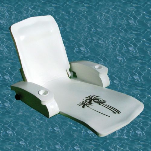 Super Soft Luxe adjustable recliner with palm tree screen prints. Smooth texture with design print. Adjustable floating chair can be used as a full length float, an upright chair or a multiposition recliner. Double thick layers of soft vinyl coated foam with an internal steel frame creates unmatched stability. No more sinking too deep in the water or strugling to remain upright. Back rest folds forward for easy storage. Luxury features are a built in headrest, extra wide seat, oversized arms and two recessed beverage holders. Made with easy to clean vinyl coated foam. Adjusts to any position from fully folded to sitting, reclining and full horizontal. Made in USA.