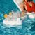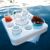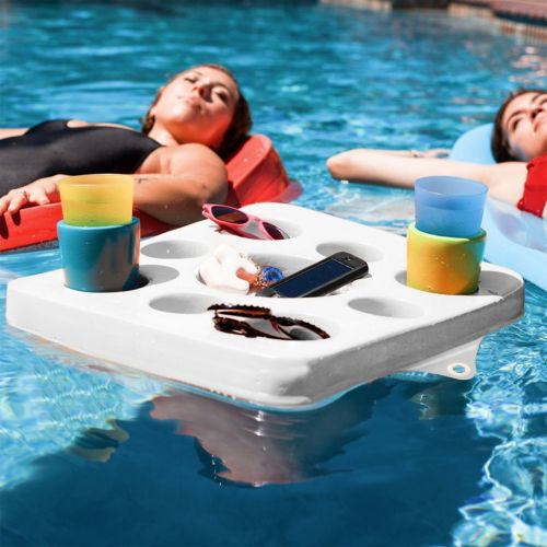 White Kool Tray from TRC. Floating refreshments tray featuring nine holes of various sizes to accomodate a mixed assortmenst of beverages, containers, snacks and personal items. 2" thick. Size 20" × 16".