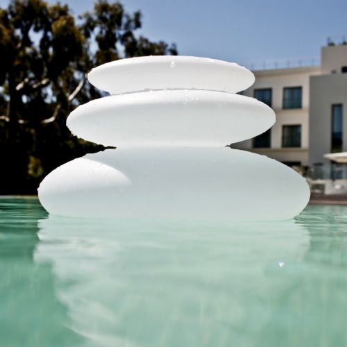 Zen waterproof designer lamp is shockproof and cordless. Evoking three smooth pebbles laid on top of each other, this unique lamp defines the word Zen. Rechargeable for up to 12 hours illumination. Provides white light and yellow candle effect as well as 160,000 colors with random, select or memory functions, so you can choose the color you would like. Perfect for poolside, backyard or patio.