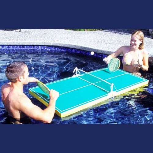 Floating table tennis game with paddles and balls included. Table tennis board can be used on the water or on any table. Solid foam table measures 54 inches by 27 inches. Hard surface top provides excellent playback action. Includes two floating paddles, game net with supports, and 3 regulation balls. All items are made with non corrosive plastic and foam components. Perfect for water and pool fun.