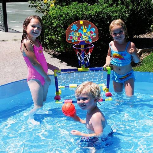Kids mini water basketball and water polo game is great for introducing kids to water interaction and sports. This is a two in one game that has both a basketball rim and a water polo goal attached to each other. Great for developing coordination skills in water. Set includes water polo goal, net, basketball rim, and one mini water polo ball and one mini basketball. Goal size is 16 inch wide and 10 inches high. Floating game is fun. Hours of fun in the pool with a simple two in one game.