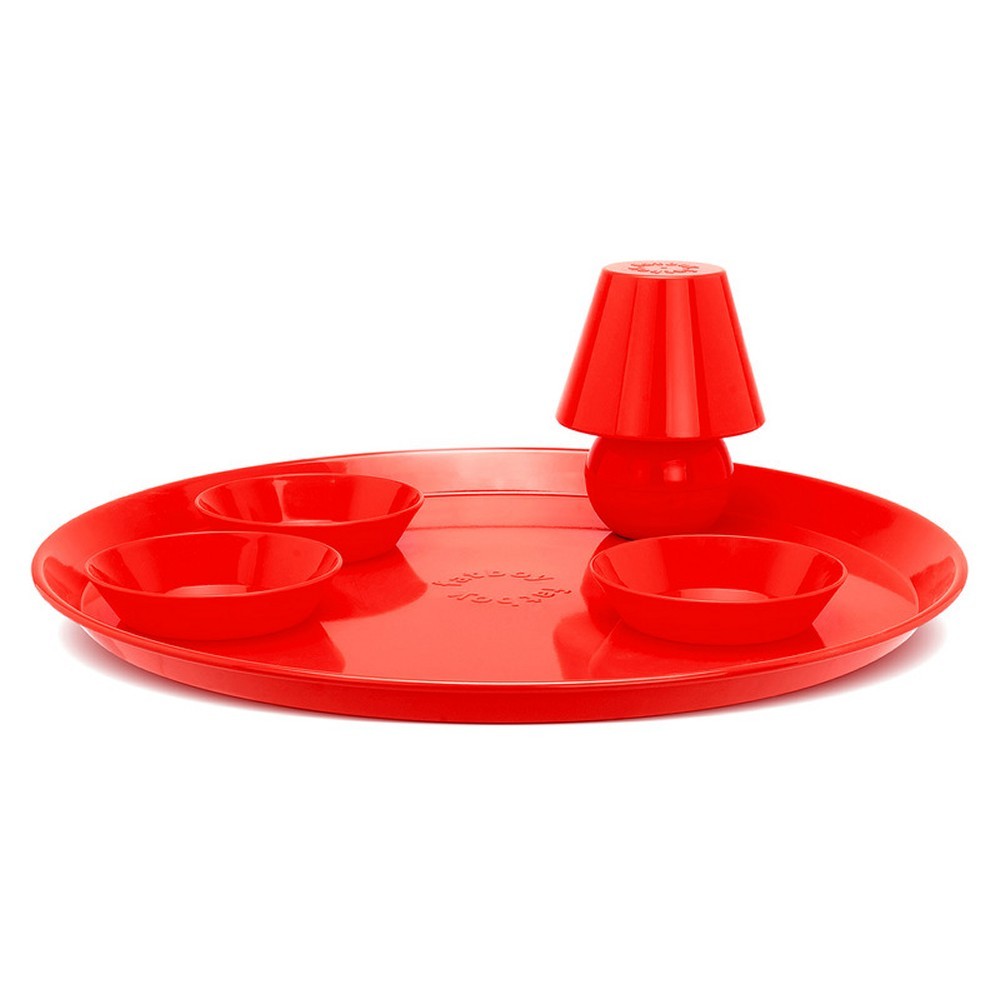 The (FATBOY)RED Special Edition Snacklight is made for indoor and outdoor use. The tray is made out of high-quality metal with a high-gloss coating. The lamp and three bowls are made of Polypropylene material. The bowls are not microwaveable or dishwasher proof.