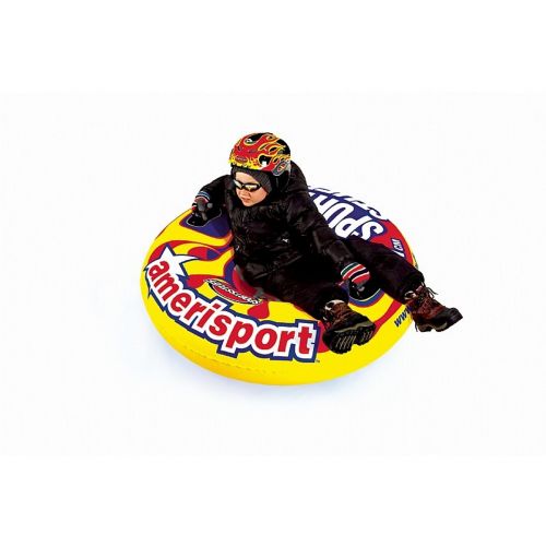 Amerisport snow tube is a hot classic round tube made extra large to enable various riding positions. Fly down your favorite sledding hill gripping the oversized PVC molded handles and feeling the air cushioned comfort of this giant Americana joy ride. Enjoy the bright patriotic graphics of the Amerisport all year round by thrashing down the slopes during the winter or lounging in the summer at your favorite pool, beach, or lake. 1 rider. Maximum capacity 170 lbs.