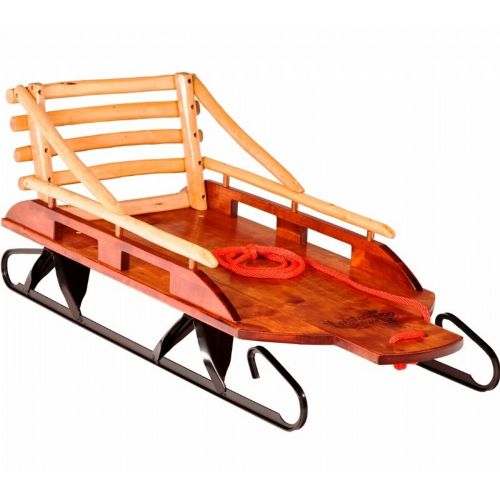 Bambino classico wooden pull sleds are handmade in Silverton, Colorado. Made with beautiful thick birch planks, hand-carved willow hand rails, stainless-steel hardware, copper accents and a marine-grade finish. Meets all ASTM and USC child safety criteria. The marine-grade finish is lead-free. This sled can easily hold two toddlers or a single older child. Extra-long rope included. Measures 34"L × 14"W × 13"H. Weight limit 100 lbs.