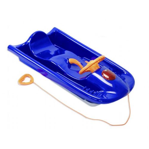 Blue snow flyer plastic snow sled is great for all kids over the age of 4. Eye catching sled features low slung driver seat, center mount emergency brake, contoured chassis, no-slip foot zones and integrated pull cord. Sled has a an alert strobe flashing its way thru the hills.This sled is a speedy solo performer that carves sweet slalom turns with the flick of the wrist.