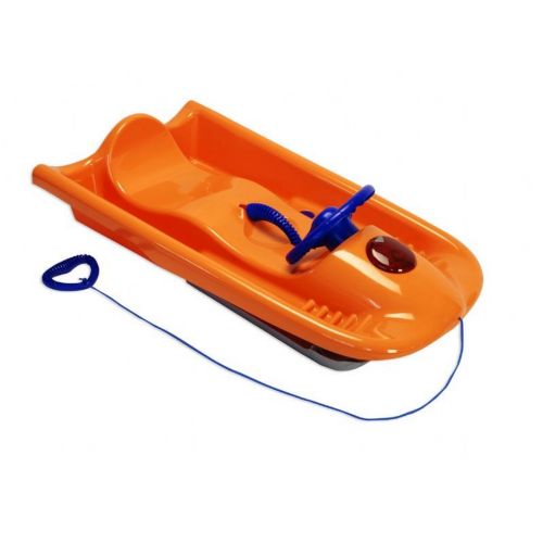 The Snow Flyer Deluxe Plastic Snow Sled Orange is great for all kids over the age of 4. This eye catching sled features a low-slung driver seat, contoured chassis, and no-slip foot zones for ultimate comfort. Take control at the helm with the center mounted emergency brake, and an integrated pull cord so you can swerve down the hillside at your own pace. You're sure to make a statement with the snow flyer's equipped siren and red strobe light!