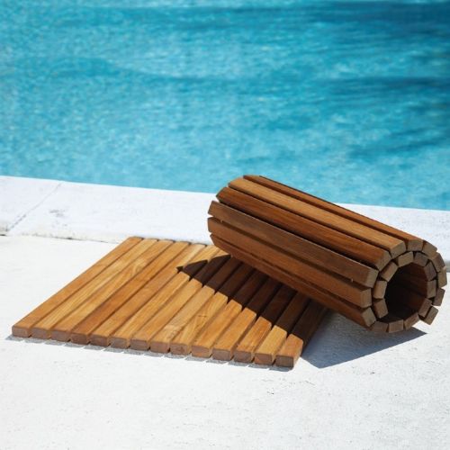 Le Spa oiled teak string floor mat is perfect for showers, locker rooms, poolside, spa or just on your balcony. String floor mat is easilt rolled for storage. Teak shower mat is machine made for perfect precision cut and fit. The generous slat thickness of almost 1 inch per slat guarantees durable heavy use. Beautiful teak outlasts any other doormat material. No wear & tear, no corrosion, no rusting, no rotting. Teak wood is very soft to the touch, does not splinter and is not slippery even when wet. Teak is temperature neutral, so even exposed to direct sun, it will not heat up and burn the skin.