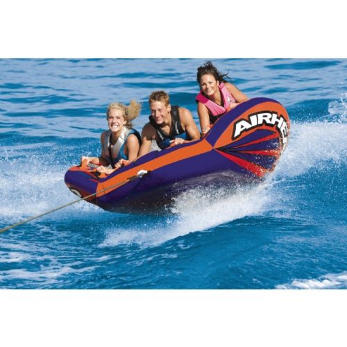 Three rider tube from Airhead.These U-shaped winged towables roll way up on edge when riders shift their weight. The wings also make them a joy to tow, they slide effortlessly across wakes. No expense was spared in MATRIX's state-of-the-art construction. They're thicker at the front to prevent submarining and thin at the back to make it easier to climb on from the water. The deluxe handles have neoprene knuckle guards. Two oversized neoprene pads are strategically located to protect knees and elbows. The durable 30 gauge RF welded PVC bladder is completely wrapped in double-stitched 840-denier nylon. A heavy-duty Kwik-Connect provides easy hook-ups and the Boston valve makes it easy and fast to deflate and inflate.