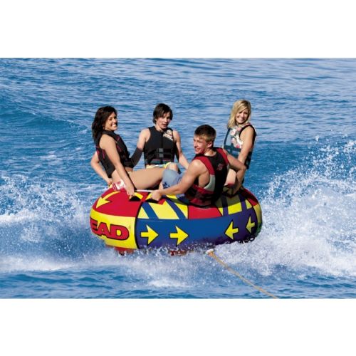 Four rider tube from Airhead. This colossal 68 inch classic has enough leg room for 4 riders. Equipped with 8 deluxe handles with neoprene knuckle guards and an inflated floor for a comfortable ride. The reinforced double-stitched nylon cover and stout 30 gauge bladder ensure long service. The heavy duty Kwik-Connect and Boston valve provide quick and easy rope hook-ups, inflating and deflating.