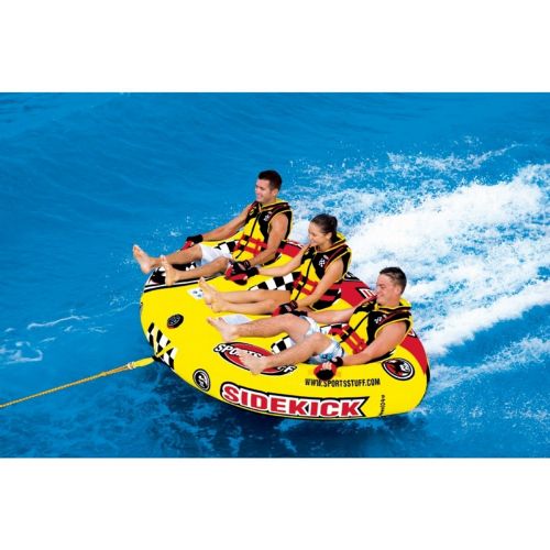This super agile cockpit towable designed for 1-3 riders will sharpen all your reflexes. Featuring three deep and comfortable cockpits for maximum stability, Air Cushioned Floors for comfort, and multiple Double Webbing Foam Handles with Knuckle Pads to protect your hands when you're holding on tight. You and your SIDEKICKs will experience thrills like no other as you're launched around whips and turns on this power-packed towable. The unique aero-dynamic construction will send this tube gliding through the water with the greatest of ease and the Aluminum Quick Connect Tow Point makes attaching and detaching your tow rope fast and easy to keep you on the water longer. Whether you are first time tubers or black belt riders, get your kicks on the new SIDEKICK 3 from Sportsstuff and maximize the excitement on any body of water!