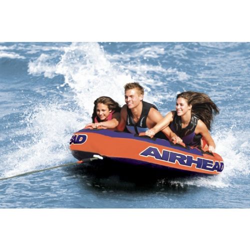 Super Slice, Airhead's high performance 3 rider low profile deck tube, will take your breath away! It's got an oversized topside neoprene body panel and 6 deluxe handles with neoprene knuckle guards, an Airhead exclusive. The 30-gauge virgin PVC bladder is fully encased by a rugged double-stitched nylon cover. Super Slice is equipped with a heavy duty Kwik-Connect and Multi-Valve for the ultimate in convenience. It's tapered in back to only 6 inches, for easy boarding from the water. 70 inch diameter.