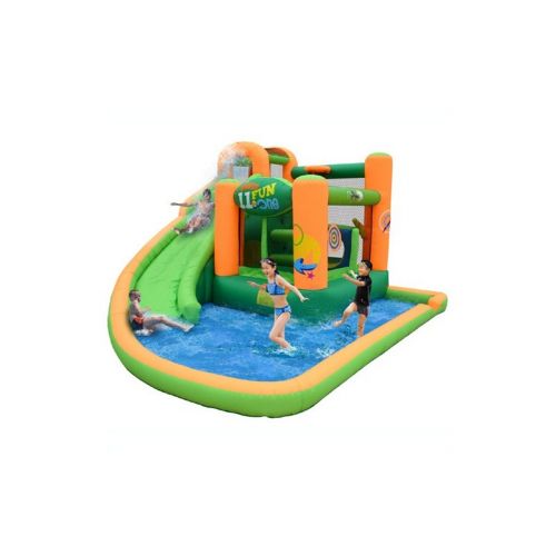 All in one wtaer park bounce house. The Endless Fun 11 in 1 Inflatable Bounce House and Waterslide lets you bounce, slide (wet and dry), climb, crawl, obstacle, shoot hoops, toss, throw, tunnel, splash, and play in a ball pit. What else could a kid need? This Inflatable Bounce House and Water Slide Combo Unit is sure to provide your kids with summers of fun. Supports up to a 300 lb total weight limit with 3 kids at 100lbs each. Includes walled landing area for slide for super splashing. Comes with oversized carry bag, hoses, stakes and blower. Dimensions: 14.3 Feet Long × 12 Feet Wide × 8 Feet High.