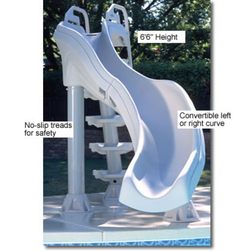 X-Stream pool slide. 6 and a half feet in height with double curves will ensure your family has a blast this season. The patented "Zoom Flume" poures up to 35 gallons per hour of water down the slide to create slippery experience. The X-Stream is also built for safety with 5 large non-skid steps and high sidewalls for added protection. The X-Stream slide boasts rugged high quality throughout with a durable resin body that can be easily configured in either a left or right curve. The slide comes complete with plumbing and hardware kit and deck anchors. Available in gray only. 250 lb weight capacity.
