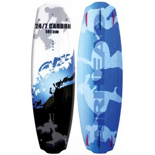 Experienced riders will enjoy the lightning quick response of our stiff 24/7 carbon fiber reinforced wakeboard. This board turns quicker and holds a harder edge than our non-carbon reinforced boards. 24/7 is designed for intermediate to expert riders weighing 150 lbs. and up. The 6 fin dual thruster setup provides ultimate hold and tracking. Riders stay on edge, get more speed into the wake and stomp landings without slipping out. The removable center fins provide tracking. The side fins are curved and angle outwards at 11 degrees to provide extra edge hold and a loose feel in neutral. The continuous rocker is fast and forgiving with smooth pop.