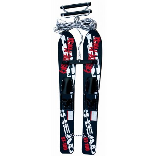 We call these skis BREAKTHRU, because you'll learn how to deep water start and the basics of water skiing quickly and easily. They feature an oversized profile, parabolic side cut, tapered tail and comfortable adjustable bindings. The stabilizer bar keeps the 47" long skis steady while the student is learning to ski. Fiberglass reinforced nylon rudders increase stability and tracking. Designed for skiers under 100 lbs. The adjustable bindings fit child size 12 to adult size 5.