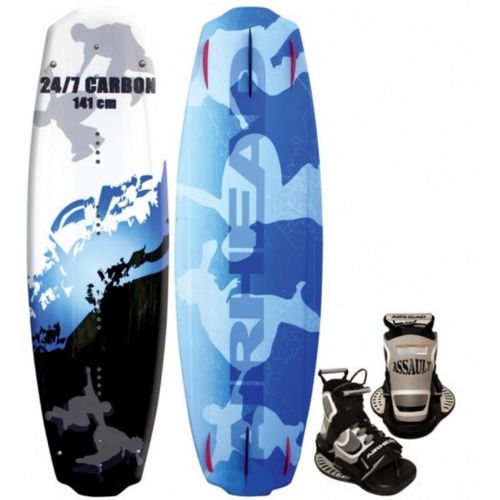 Carbon wakeboard set with Assault binding. Experienced riders will enjoy the lightning quick response of our stiff 24/7 carbon fiber reinforced wakeboard. This board turns quicker and holds a harder edge than our non-carbon reinforced boards. 24/7 is designed for intermediate to expert riders weighing 150 lbs. and up. The 6 fin dual thruster setup provides ultimate hold and tracking. Riders stay on edge, get more speed into the wake and stomp landings without slipping out. The removable center fins provide tracking. The side fins are curved and angle outwards at 11 degrees to provide extra edge hold and a loose feel in neutral. The continuous rocker is fast and forgiving with smooth pop. ASSAULT is an extra large binding designed with quality, durability and performance in mind. This supportive binding has an adjustable tow strap, heavy duty lace eyelets and a POWER STRAP for extra heel hold-down. The upper and lower double cinch lace-up system ensures a great fit. ASSAULT's footbed offers the perfect blend of cushion and support. The wakeboard mounting holes are reinforced with aluminum plates for durability. ASSAULT fits men's size 10 - 15.5 (EU 43- 49).