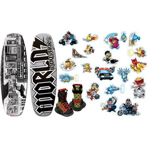 Create your own street action in the "hood" on WORLD INDUSTRIES' STICK-O-RAMA wakeboard! The wakeboard is basically an inner city background that you decorate with the stickers provided. Flameboy, Wet Willy and Devilman are making trouble and the piggy police are frantically trying to restore law and order! If you want smooth transition through turns and a consistent pop off the wake, this board is for you. The rounded end profile and beveled perimeter provide a forgiving and consistent release off the wake. Riders of all levels will enjoy the floaty nature of this 135cm free-ride wakeboard. Designed for riders up to 170 lbs., 2 removable fiberglass reinforced nylon fins provide excellent tracking. DC is a high wrap bindings provide plenty of support for aspiring youth riders. The front entry, one cinch lace-up bindings offer comfort, convenience and performance. The top straps provide extra lower leg support for more power in turns. Kid's size 13 to men's size 8.5 (EU 31-38).