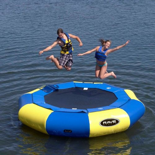Aqua Jump Eclipse water trampoline will sure offer serious summer fun for the whole family. The revolutionary Eclipse has been uniquely designed to provide 30% more jump surface, 50% faster set-up, and a 30% reduction in weight for easier handling to and from the water. The Eclipse 120 is 12 foot in diameter and comes complete with RAVE's High Speed Inflator/Deflator and Anchor Connection Kit.