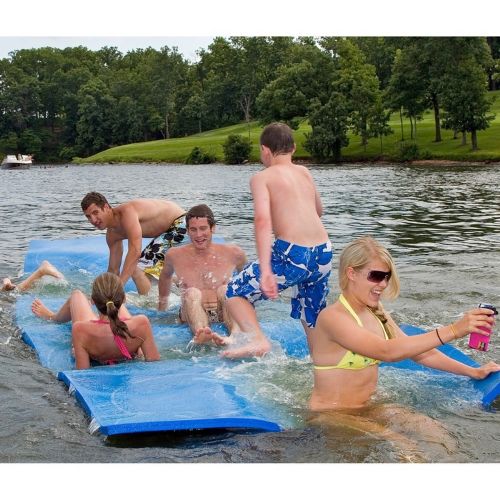 Original WaterMat the only mat that floats. Carries up to 1200 lbs. On a lake or ocean, this mat is the ultimate toy for kids and adults of all sizes. Ultra buoyant mat is safe, doesn't sink, doesn't retain water, anchors easily, easy to move and carry. WaterMat tethering system allows you to quickly and simply attach your WaterMat to an anchor or other structure. Great for endless water fun and also perfect for sunbathing, slipping and sliding, using as a platform and many more fun activities. Made with closed cell foam. No sharp edges and hard surfaces. Watermat has no metal parts. Mat is 1.25 inch thick. Size: 6 feet × 20 feet. Recommendedfor total weight of 1200 lbs. Made in USA.