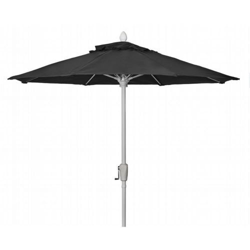 7.5' Octagon Market 8 Rib Crank Lift White Frame with Black Marine Grade Solution Dyed Acrylic Canopy. The popular FiberBuilt Market umbrella has contract grade components (a thicker wall thickness on the 1.5" diameter pole, 0.5" fiberglass ribs, marine grade solution dyed acrylic canopy) that work beautifully in backyard patios and condominium pools, as well as restaurants, hotels, and other commercial and hospitality locations. These residential/contract grade umbrellas provide years of durable service and a choice of fabrics and finishes. The Market umbrellas can be used both in-table and freestanding. The 100% solution-dyed acrylic canopy has excellent UV resistance to sunlight. It is easy to clean, and resistant to stains, water, fading, mold, and mildew. The Market umbrellas can be used for both in-table and freestanding applications. 8 flexible fiberglass ribs with molded nylon joints, hubs, and end tips. The 1.5" diameter two piece aluminum pole with a .080" wall thickness is available with crank, with or without tilt, manual push up, or pulley pin lift.