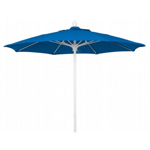 7.5' Octagon Market 8 Rib Push Up & Pin Lift White Frame with Pacific Blue Marine Grade Solution Dyed Acrylic Canopy. The popular FiberBuilt Market umbrella has contract grade components (a thicker wall thickness on the 1.5" diameter pole, 0.5" fiberglass ribs, marine grade solution dyed acrylic canopy) that work beautifully in backyard patios and condominium pools, as well as restaurants, hotels, and other commercial and hospitality locations. These residential/contract grade umbrellas provide years of durable service and a choice of fabrics and finishes. The Market umbrellas can be used both in-table and freestanding. The 100% solution-dyed acrylic canopy has excellent UV resistance to sunlight. It is easy to clean, and resistant to stains, water, fading, mold, and mildew. The Market umbrellas can be used for both in-table and freestanding applications. 8 flexible fiberglass ribs with molded nylon joints, hubs, and end tips. The 1.5" diameter two piece aluminum pole with a .080" wall thickness is available with crank, with or without tilt, manual push up, or pulley pin lift.