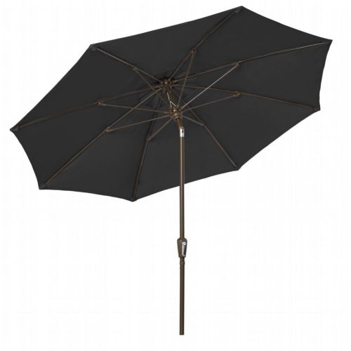 9' Octagon Market 8 Rib Crank Lift & Push Button Tilt Champagne Bronze Frame with Black Marine Grade Solution Dyed Acrylic Canopy. The popular FiberBuilt Market umbrella has contract grade components (a thicker wall thickness on the 1.5" diameter pole, 0.5" fiberglass ribs, marine grade solution dyed acrylic canopy) that work beautifully in backyard patios and condominium pools, as well as restaurants, hotels, and other commercial and hospitality locations. These residential/contract grade umbrellas provide years of durable service and a choice of fabrics and finishes. The Market umbrellas can be used both in-table and freestanding. The 100% solution-dyed acrylic canopy has excellent UV resistance to sunlight. It is easy to clean, and resistant to stains, water, fading, mold, and mildew. The Market umbrellas can be used for both in-table and freestanding applications. 8 flexible fiberglass ribs with molded nylon joints, hubs, and end tips. The 1.5" diameter two piece aluminum pole with a .080" wall thickness is available with crank, with or without tilt, manual push up, or pulley pin lift.