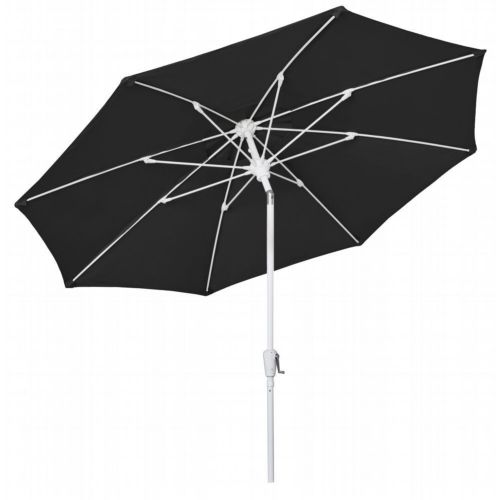 9' Octagon Market 8 Rib Crank Lift & Push Button Tilt White Frame with Black Marine Grade Solution Dyed Acrylic Canopy. The popular FiberBuilt Market umbrella has contract grade components (a thicker wall thickness on the 1.5" diameter pole, 0.5" fiberglass ribs, marine grade solution dyed acrylic canopy) that work beautifully in backyard patios and condominium pools, as well as restaurants, hotels, and other commercial and hospitality locations. These residential/contract grade umbrellas provide years of durable service and a choice of fabrics and finishes. The Market umbrellas can be used both in-table and freestanding. The 100% solution-dyed acrylic canopy has excellent UV resistance to sunlight. It is easy to clean, and resistant to stains, water, fading, mold, and mildew. The Market umbrellas can be used for both in-table and freestanding applications. 8 flexible fiberglass ribs with molded nylon joints, hubs, and end tips. The 1.5" diameter two piece aluminum pole with a .080" wall thickness is available with crank, with or without tilt, manual push up, or pulley pin lift.