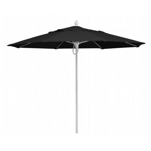 9' Octagon Market 8 Rib Pulley & Pin Lift White Frame with Black Marine Grade Solution Dyed Acrylic Canopy. The popular FiberBuilt Market umbrella has contract grade components (a thicker wall thickness on the 1.5" diameter pole, 0.5" fiberglass ribs, marine grade solution dyed acrylic canopy) that work beautifully in backyard patios and condominium pools, as well as restaurants, hotels, and other commercial and hospitality locations. These residential/contract grade umbrellas provide years of durable service and a choice of fabrics and finishes. The Market umbrellas can be used both in-table and freestanding. The 100% solution-dyed acrylic canopy has excellent UV resistance to sunlight. It is easy to clean, and resistant to stains, water, fading, mold, and mildew. The Market umbrellas can be used for both in-table and freestanding applications. 8 flexible fiberglass ribs with molded nylon joints, hubs, and end tips. The 1.5" diameter two piece aluminum pole with a .080" wall thickness is available with crank, with or without tilt, manual push up, or pulley pin lift.