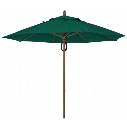 9' Octagon Market 8 Rib Pulley & Pin Lift Champagne Bronze Frame with Forest Green Marine Grade Solution Dyed Acrylic Canopy. The popular FiberBuilt Market umbrella has contract grade components (a thicker wall thickness on the 1.5" diameter pole, 0.5" fiberglass ribs, marine grade solution dyed acrylic canopy) that work beautifully in backyard patios and condominium pools, as well as restaurants, hotels, and other commercial and hospitality locations. These residential/contract grade umbrellas provide years of durable service and a choice of fabrics and finishes. The Market umbrellas can be used both in-table and freestanding. The 100% solution-dyed acrylic canopy has excellent UV resistance to sunlight. It is easy to clean, and resistant to stains, water, fading, mold, and mildew. The Market umbrellas can be used for both in-table and freestanding applications. 8 flexible fiberglass ribs with molded nylon joints, hubs, and end tips. The 1.5" diameter two piece aluminum pole with a .080" wall thickness is available with crank, with or without tilt, manual push up, or pulley pin lift.
