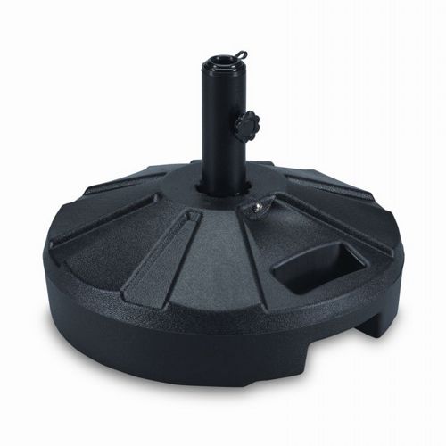 Molded plastic patio umbrella stand black fillable with water or sand. Made for the free standing residential use of 7½ feet and 9 feet umbrellas only. Base accepts up to 1¾ inch diameter poles. Weighs 35 lbs filled with water, 50 lbs filled with sand. Simple assembly.