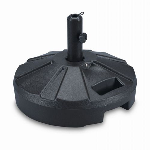 Molded plastic patio umbrella stand bronze fillable with water or sand. Made for the free standing residential use of 7½ feet and 9 feet umbrellas only. Base accepts up to 1¾ inch diameter poles. Weighs 35 lbs filled with water, 50 lbs filled with sand. Simple assembly. Measures 16 inch diameter × 11½ inch overall height.