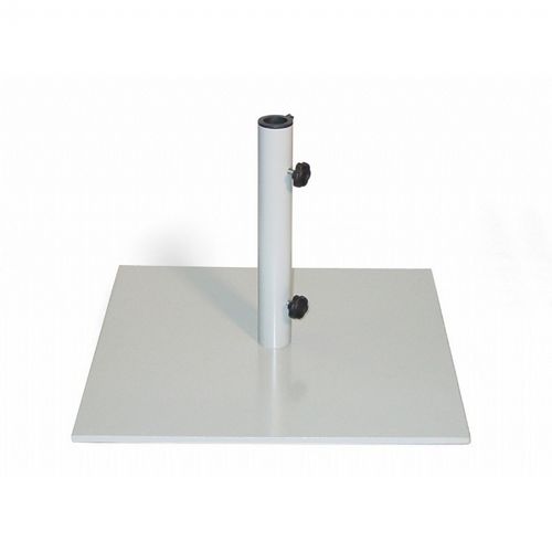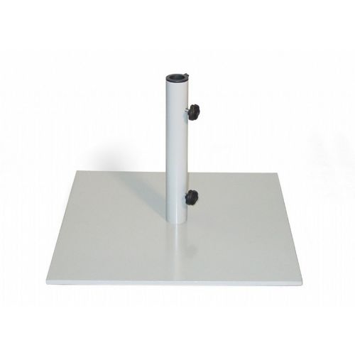 Steel 40 lbs. base for use with 6 and 7 feet umbrellas. Accommodates pole diameter up to 1 ⅝ inches. Heavy duty steel base is powder coated with white finish. Dimensions: 19 inch × 19inch with 12.5 inches height.
